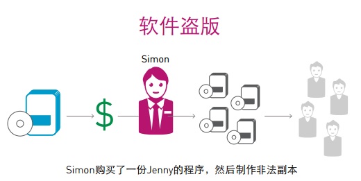 下圖顯示了一個(gè)簡單的軟件盜版情境。某人購買了一個(gè)許可證以使用你的某個(gè)軟件程序制作多個(gè)副本,然后進(jìn)行非法共享或銷售給他人。