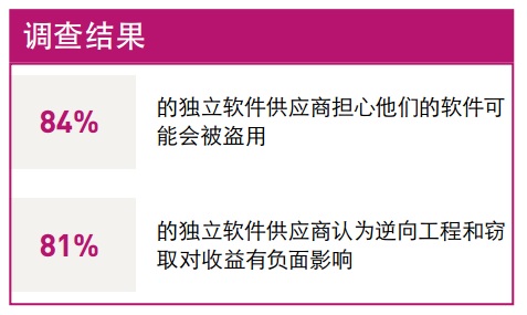 多數(shù)典型軟件公司或智能設(shè)備制造公司的市場價(jià)值。相應(yīng)地,由于公司在爭取業(yè)務(wù)方面變得更加積極,競爭壓力也會自然增加。競爭性的偵查活動越來越普遍,而您寶貴的軟件知識產(chǎn)權(quán)(包含代碼、算法、應(yīng)用程序數(shù)據(jù)文件和商業(yè)機(jī)密)均處在窺探視線、逆向工程、竊取以及競爭對手進(jìn)行偽造剽竊的風(fēng)險(xiǎn)之中。毫無疑問,逆向工程和竊取商業(yè)機(jī)密會對軟件出版商造成負(fù)面影響。在最近的一次調(diào)查中,全球獨(dú)立軟件開發(fā)商受訪者中有壓倒性的84%報(bào)告稱他們擔(dān)心自己的軟件可能會被盜用。81%的人認(rèn)為逆向工程和竊取正在耗掉他們的收益。