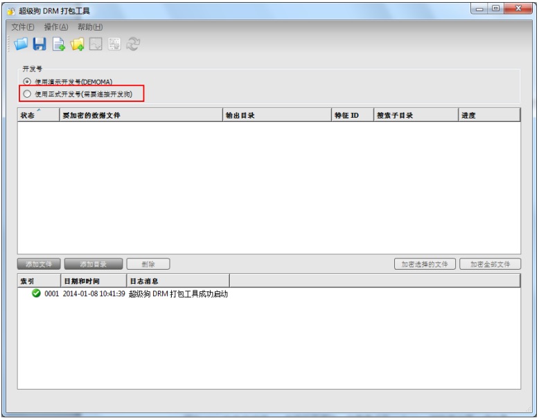 2. 運行超級狗 DRM 打包工具(<超級狗安裝目錄>\Tools 目錄下的 dataencrypt.exe),加密要保護的 Office 文檔和 PDF 文檔。