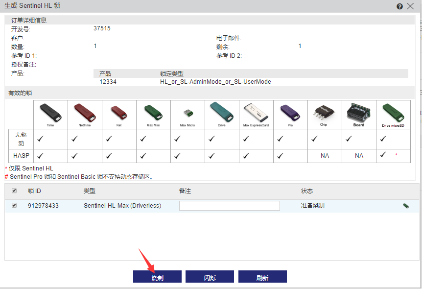 3、新建訂單、燒鎖---設置好要燒鎖的數量、對應的軟件產品,開始寫鎖。