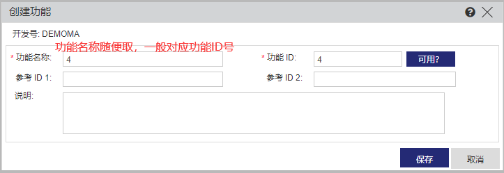 請按圖示步驟選擇1目錄,2功能,3開發號,4新建功能,其中開發號是對應5個字母的主鎖開發號,測試用戶請選擇DEMOMA