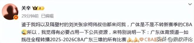 北京時間12月11日,根據廣東體育頻道記者“關辛”的報道,“鑒于我媽以及隔壁村的劉關張宗祠師叔伯都來問我,廣體是不是不轉新賽季的CBA[允悲]所以,我覺得有必要占用一下公共資源,來特別說明一下:廣東體育頻道一如既往全程轉播2025-2026CBA廣東三雄的所有比賽”